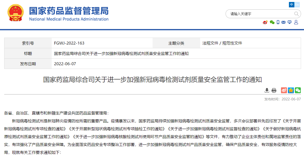 新冠病毒检测试剂是新冠肺炎疫情防控所需的重要产品。疫情暴发以来,国家药监局持续加强新冠病毒检测试剂质量安全监管,多次会议部署并先后印发了《关于开展新冠病毒检测试剂专项检查的通知》《关于开展新型冠状病毒检测试剂专项抽检工作的通知》《关于进一步加强新冠病毒检测试剂监督检查的通知》《关于做好新冠病毒抗原检测试剂质量安全监管工作的通知》《关于进一步加强新冠病毒核酸检测试剂使用环节产品质量安全监管的通知》等文件,有力推动了企业主体责任和属地监管责任的落实,有效强化了产品质量安全保障。为全面落实药品安全专项整治工作部署,进一步加强新冠病毒检测试剂产品质量安全监管,确保产品质量安全,有效服务疫情防控大局,现就有关工作要求通知如下: