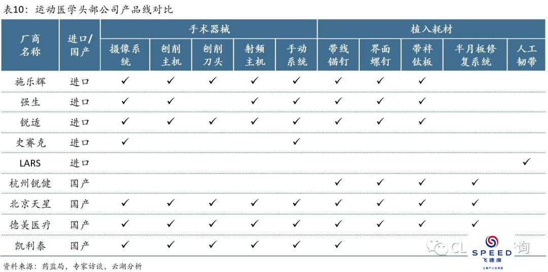 运动医学头部公司的产品线(仅包含已注册上市产品)对比如下:
