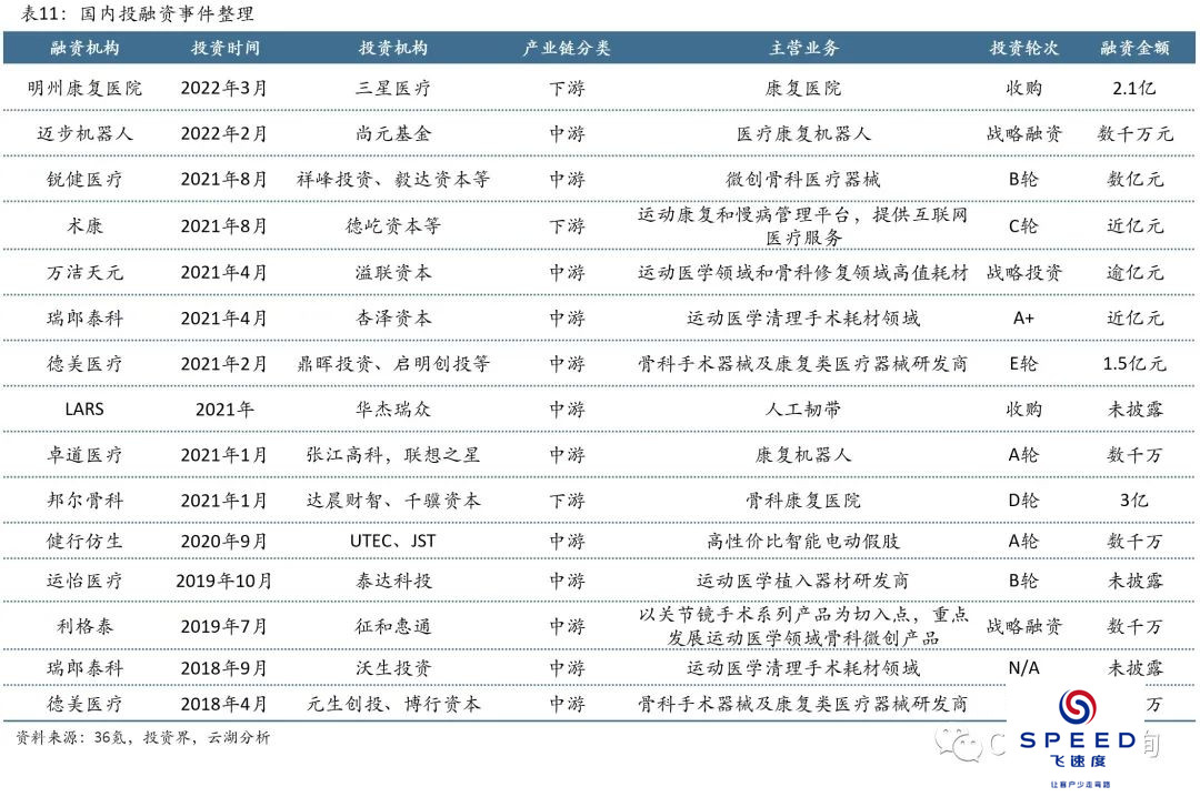 未来随着运动医学在国内骨科领域市场份额的逐渐提高以及相关产品的应用逐渐受到术者和患者的认可,国内厂商在运动医学领域的布局将变得更加频繁,因此预计未来运动医学领域高值耗材的国产替代进程也将逐步加速。行业整合方面,未来随着中国运动医学市场逐步走向成熟,与国际市场类似,头部企业将逐步倾向以并购为手段拓展自身产品线。