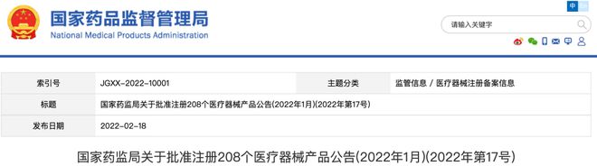 2022年1月,国家药品监督管理局共批准注册医疗器械产品208个。其中,境内第三类医疗器械产品151个,进口第三类医疗器械产品21个,进口第二类医疗器械产品33个,港澳台医疗器械产品3个。