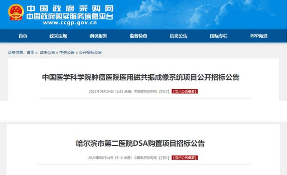 8月4日,中国政府采购网发布两则招标公告。中国医学科学院肿瘤医院、哈尔滨市第二医院这两家知名大三甲,采购共3400万的高端医疗设备,只要国产!