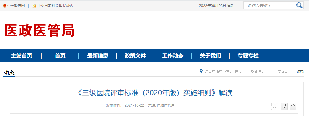 为指导各地做好医院评审工作,根据《医疗机构管理条例》《医疗机构评审办法》和《医院评审暂行办法》,我委于2020年制定发布了《三级医院评审标准(2020年版)》(国卫医发〔2020〕26号)(以下简称《标准》)。《标准》颁布实施后,在指导各地加强评审标准管理、规范评审行为、引导医院加强自我管理等方面发挥了重要作用。为指导各地充分理解、掌握《标准》,运用《标准》开展医院评审工作,指导医院利用《标准》加强日常管理,我委组织制定了《三级医院评审标准(2020年版)实施细则》(以下简称《细则》),供各地在评审工作中参照使用。