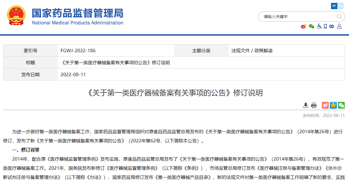 为进一步做好第一类医疗器械备案工作,国家药品监督管理局组织对原食品药品监管总局发布的《关于第一类医疗器械备案有关事项的公告》(2014年第26号)进行修订,发布了新《关于第一类医疗器械备案有关事项的公告》(2022年第62号,以下简称本公告)。