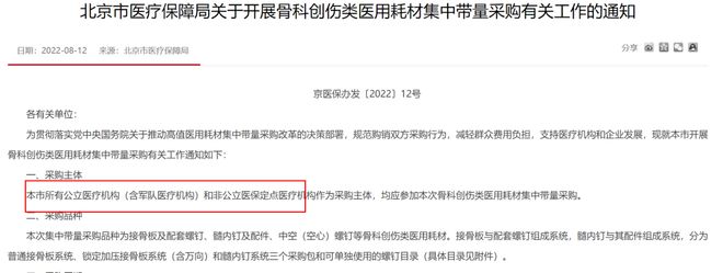 就在同一天(8月12日),北京市医保局发布了《关于开展骨科创伤类医用耗材集中带量采购有关工作的通知》,明确本次带量采购的主体,公立医院、非公立医保定点医疗机构须全部参加。