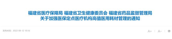 8月12日,福建省医疗保障局 福建省卫生健康委员会 福建省药品监督管理局联合发布了《关于加强医保定点医疗机构高值医用耗材管理的通知》(以下简称《通知》)(原文见文末)。