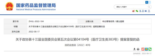 8月17日,国家药监局网站发布《关于政协第十三届全国委员会第五次会议第04104号(医疗卫生类383号)提案答复的函》。