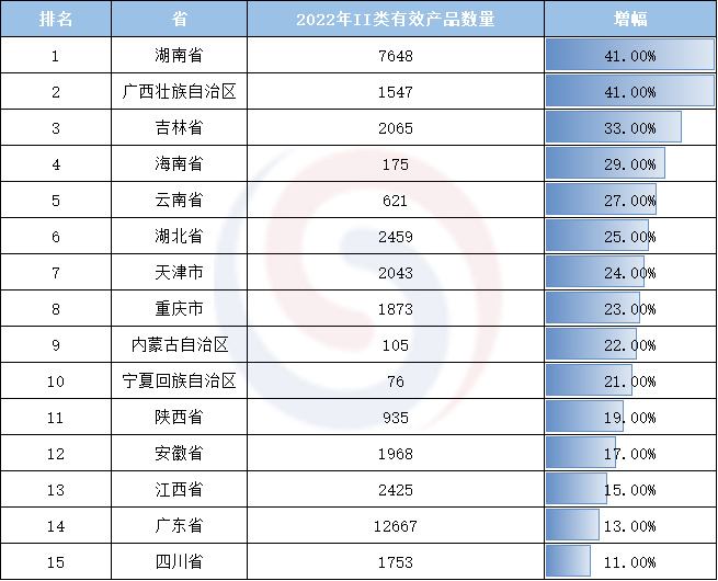 2022年全国各省医疗器械Ⅱ类有效产品数量增速排名第一的为湖南省,增速达41%,广西壮族自治区和吉林省以41%、33%分列第二、第三;海南省、云南省和湖北省紧随其后。