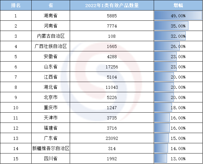 2022年全国各省医疗器械Ⅰ类有效产品数量增速排名第一的为湖南省,增速达49%,河南省和内蒙古自治区以35%、32%分列第二、第三;广西壮族自治区、安徽省、山东省紧随其后。