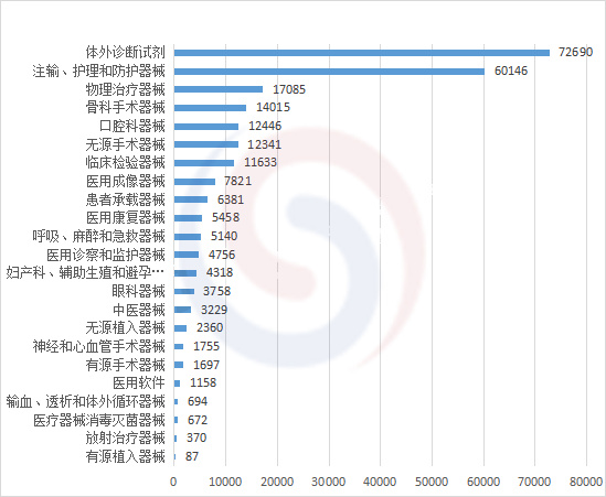 从细分领域来看,医疗器械有效产品数量排行中,体外诊断试剂最多,共计72690件,其次是注输、护理和防护器械60146件、物理治疗器械17085件。有效产品数量最少的是有源植入器械,为87件。