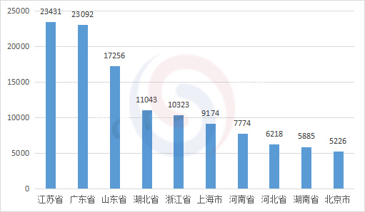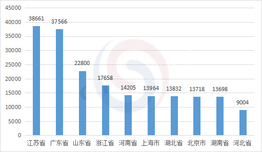 从全国各省医疗器械有效产品数量分布看,江苏省38661件,排名第一;广东省37566件,排名第二;山东省22800件,排名第三。其中江苏省和广东省有效产品数量远超全国其他省市。