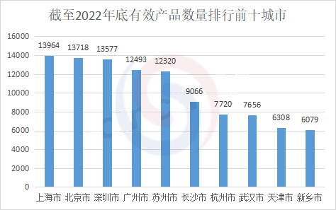 从各城市有效产品数量排名看,上海市13964件位居全国第一;北京市、深圳市分别以13718件与13577件排名第二与第三。