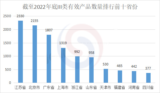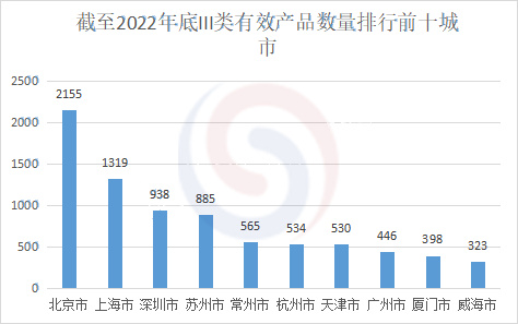 从各城市Ⅲ类有效产品数量排名看,北京市以2155件位居全国第一;上海市、深圳市分别以1319件与938件排名第二与第三;TOP10城市还有苏州市、常州市、杭州市、天津市、广州市、厦门市和威海市。