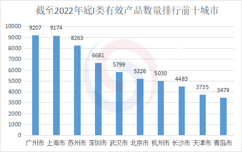 从各城市Ⅰ类有效产品数量排名看,广州市以9207件位居全国第一;上海市、苏州市分别以9174件与8263件排名第二与第三;其他前十城市的Ⅰ类有效产品数量差距并不显著,分别为深圳市、武汉市、北京市、杭州市、长沙市、天津市和青岛市。