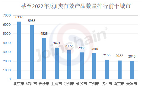 从各城市Ⅱ类有效产品数量排名看,北京市以6337件位居全国第一;深圳市、长沙市分别以5958件与4525件排名第二与第三;其他前十城市的Ⅱ类有效产品数量差距并不显著,分别为上海市、苏州市、新乡市、广州市、杭州市、南京市和天津市。