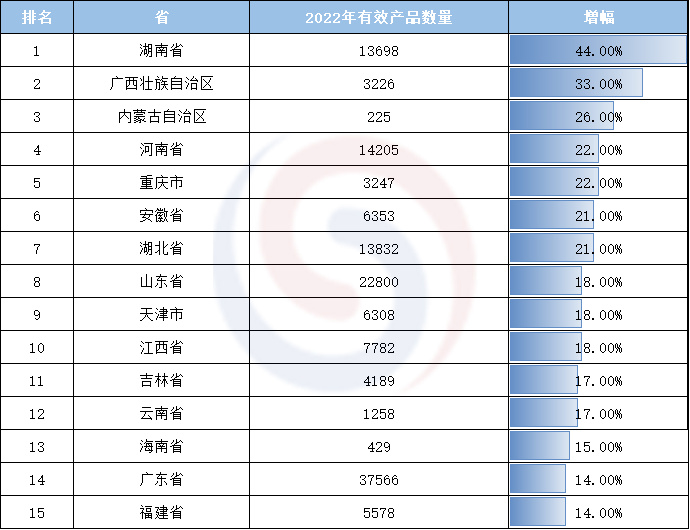 表1 2022年全国境内各省医疗器械有效产品数量增速排名(TOP15)