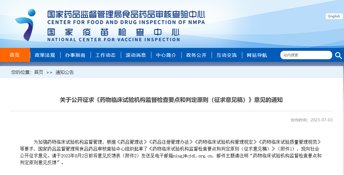 为加强药物临床试验机构监督管理,根据《药品管理法》《药品注册管理办法》《药物临床试验机构管理规定》《药物临床试验质量管理规范》等要求,国家药品监督管理局食品药品审核查验中心组织起草了《药物临床试验机构监督检查要点和判定原则(征求意见稿)》(附件1),现向社会公开征求意见。请于2023年8月2日前将意见反馈表(附件2)发送至电子邮箱ningj@cfdi.org.cn,邮件主题请注明“药物临床试验机构监督检查要点和判定原则意见反馈”。