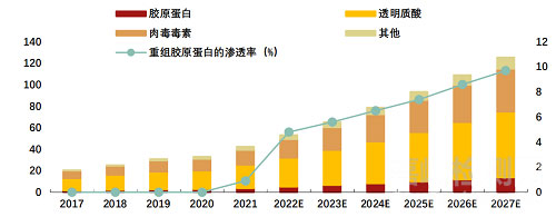 Frost &Sullivan预测,重组胶原蛋白的注射类市场规模2022-2027年均复合增速有望达到36.5%(高于透明质酸的17.9%和肉毒毒素的 18.2%),渗透率有望从2022年的4.8%提升至2027年的9.7%。