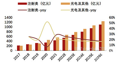 非手术类别中,注射类增速更快。非手术类医美可以进一步划分为注射和光电类,光电类通过特定波长光能刺激皮下组织破坏和新生,注射类通过针剂材料实现填充或萎缩,不同治疗手段各有功效特点。据华经产业研究院统计,2021年我国注射类项目市场规模约424亿元,2026年或达 1091亿元,2021-2026E预计CAGR达20.81%,高于光电类别 17.61%的年复合增速。