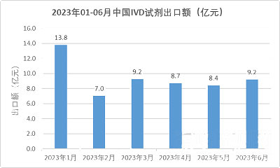 依据海关HS编码3822商品最新数据整理,中国2023年01-06月的IVD试剂出口额约为56亿元,其中2023年01月份出口量最大,上半年月平均出口约为9.4亿元。