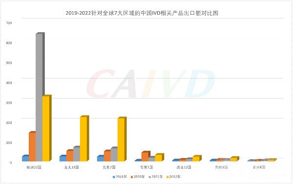 2019-2022 针对全球7大区域的中国IVD相关产品出口额对比图↑
