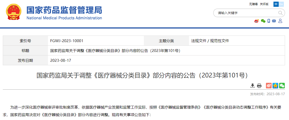 为深化医疗器械审评审批制度改革,进一步适应医疗器械产业的发展和监管需求,国家药品监督管理局根据《医疗器械监督管理条例》以及《医疗器械分类目录动态调整工作程序》的要求,决定对《医疗器械分类目录》的部分内容进行调整。此举旨在提升医疗器械的注册审批质量和监管效能,确保患者用械安全。