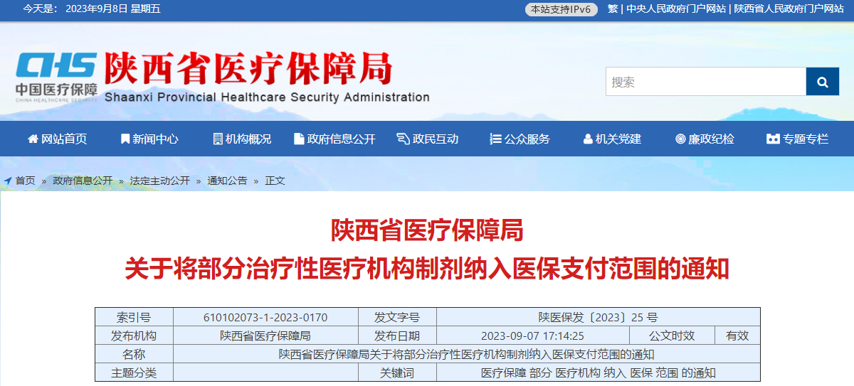 2023年9月7日,陕西省医疗保障局发布了一份重要通知,题为《关于纳入医保支付范围的治疗性医疗机构制剂名单》。通知中公布了一批共计533种治疗性医疗机构制剂,通称为“院内制剂”,将纳入基本医疗保险(包括生育保险)基金支付范围。这一政策的实施将为陕西省中医药事业和医疗机构的高质量发展提供积极支持。