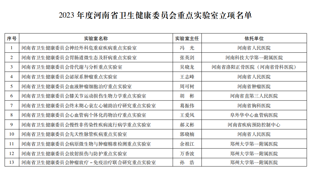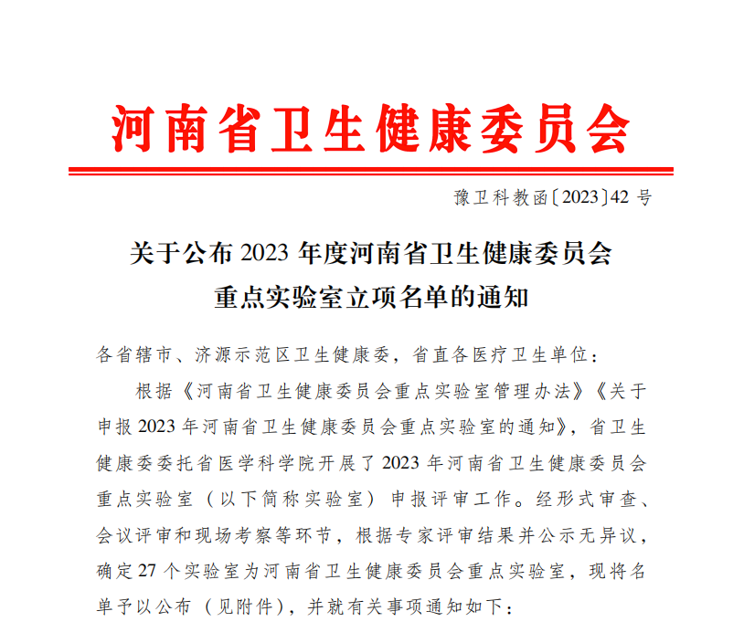 近日,河南省卫健委下发豫卫科教函〔2023〕42 号《关于公布 2023年度河南省卫生健康委员会重点实验室立项名单的通知》。
