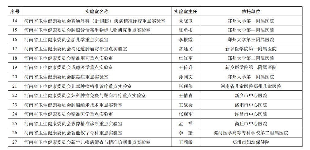 此次,全省共审批通过重点实验室立项27项,包括河南省卫生健康委员会儿童肿瘤精准诊疗重点实验室、河南省卫生健康委员会新生儿疾病筛查与精准诊断重点实验室、河南省卫生健康委员会智能数字骨科重点实验室等。具体如下: