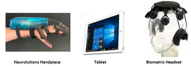 美国Neurolutions公司的“IpsiHand上肢康复系统”于2021年4月成为首个FDA批淮的用于康复的非侵入式脑机接口机器人,该系统由脑电头套、机器人外骨骼和平板电脑组成(下图所示),能够通过检测大脑未受损部分电信号,控制装在患侧手上的外骨酪,从而改善病患的抓握能力。该产品的类别为脑电图(EEG)驱动的上肢动力锻炼器,属于二类医疗器械。