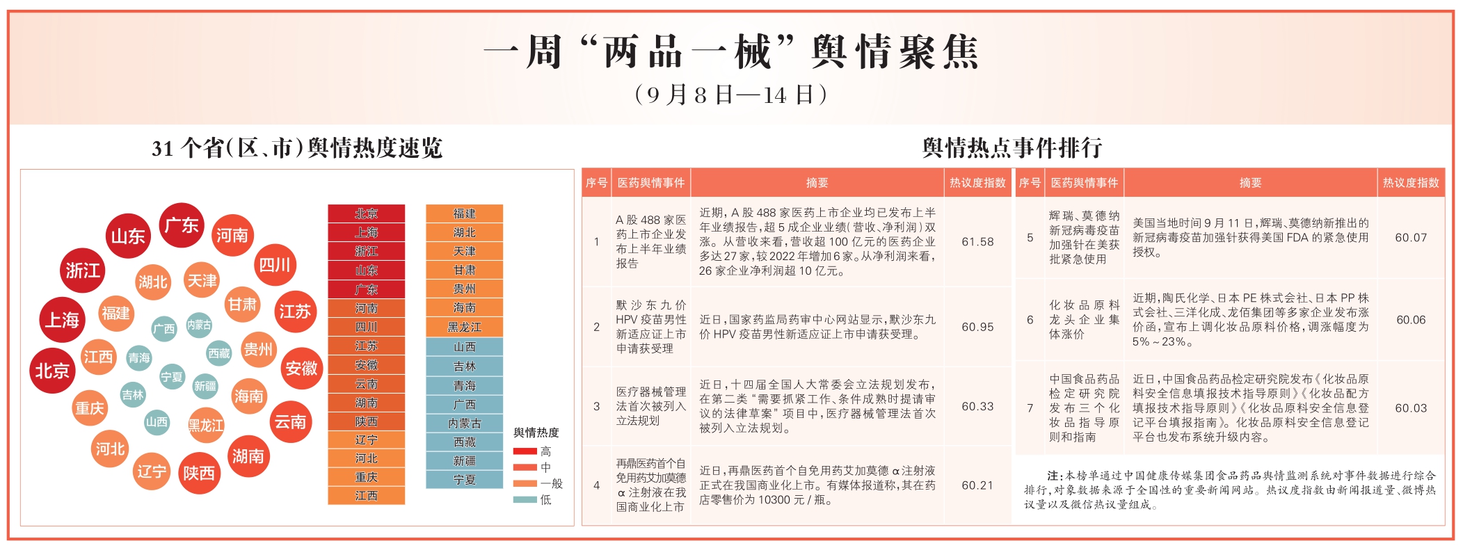 近日,中国健康传媒集团舆情监测中心发布“两品一械”企业“冒烟指数”(2023年第九期),公开风险指数排名前十(共30家)的企业名单。