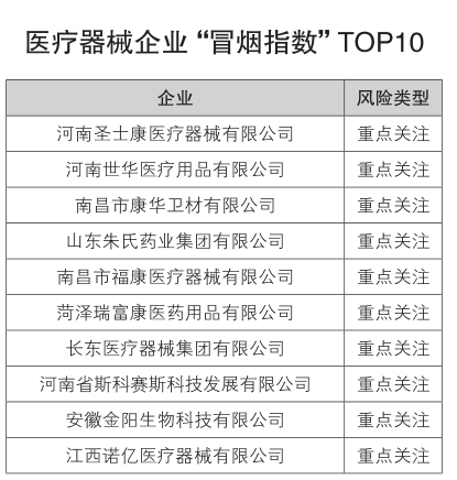 近日,医疗器械企业“冒烟指数”(2023年第九期)显示,河南圣士康医疗器械有限公司、河南世华医疗用品有限公司、南昌市康华卫材有限公司、山东朱氏药业集团有限公司、南昌市福康医疗器械有限公司、菏泽瑞富康医药用品有限公司、长东医疗器械集团有限公司、河南省斯科赛斯科技发展有限公司、安徽金阳生物科技有限公司、江西诺亿医疗器械有限公司位列前十名,均为“重点关注”企业。