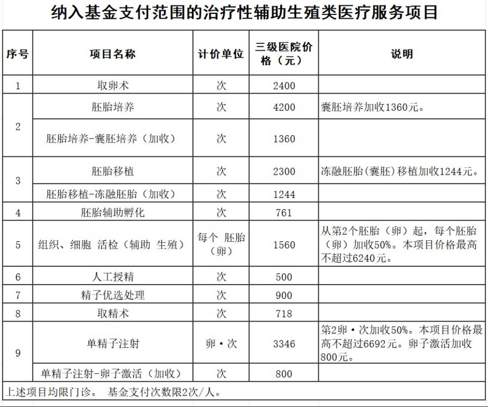 据自治区医保局、自治区人力资源社会保障厅、自治区卫健委三部门联合印发的《关于将部分治疗性辅助生殖类医疗服务项目纳入基本医疗保险和工伤保险基金支付范围的通知》(以下简称《通知》),纳入医保报销范围的治疗性辅助生殖类医疗服务项目,均限门诊,且每人最多只能报销2次,基本覆盖每名参保人2个辅助生殖移植周期的治疗费用