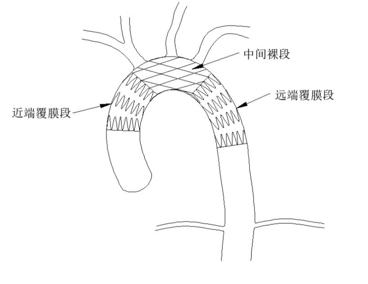 “A型夹层全腔内重建系统”为国际首创,其包含两组支架,一组采用三段式“覆膜-未覆膜-覆膜”设计,对应主动脉的“升主动脉-主动脉弓-降主动脉”三个位置,中段未覆膜可以保障主动脉弓三个上分支血管的血流流动,另一组采用两段式“覆膜-未覆膜”的设计。该支架可以简化手术操作,缩短手术时间,降低夹层破裂风险,改善降主动脉远期重构,适用于破裂口不在主动脉弓处的A型夹层治疗。