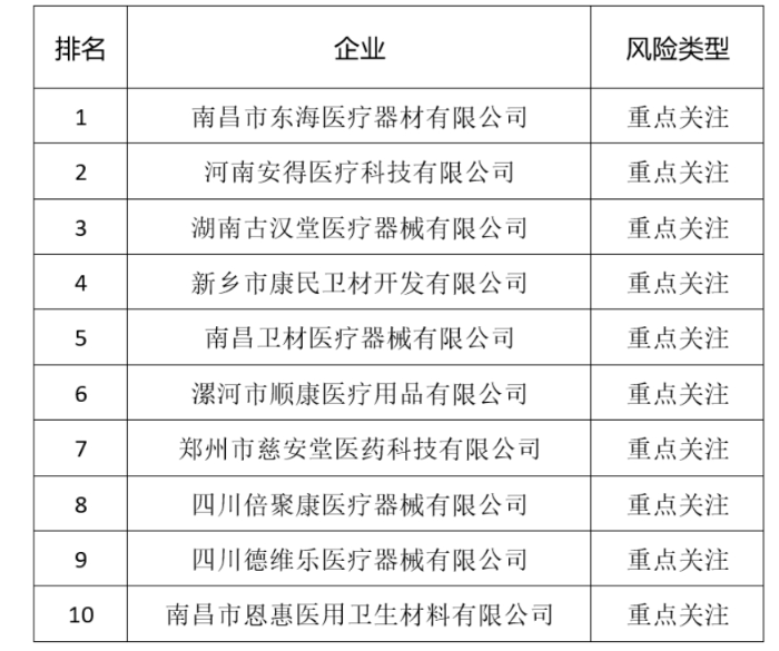 南昌市东海医疗器材有限公司因2批次产品抽检不合格,且今年多次受到行政处罚,风险指数排名第一。