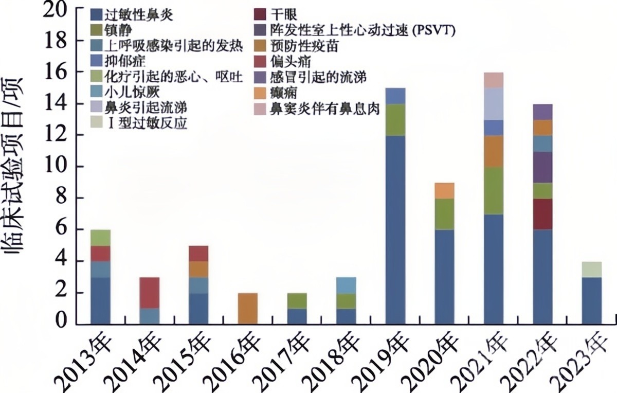 中国注册临床试验鼻用喷雾剂的适应证包括过敏性鼻炎、镇静、干眼、阵发性室上心动过速(paroxysmal supraventricular tachycardia,PSVT)、上呼吸道感染引起的发热、抑郁症、偏头痛、化疗引起的恶心呕吐、感冒引起的流涕、小儿惊厥、癫痫、鼻炎引起流涕、鼻窦炎伴有鼻息肉、Ⅰ型过敏反应、预防性疫苗,共15种类型。其中过敏性鼻炎有41项(51.3%),占比最高。