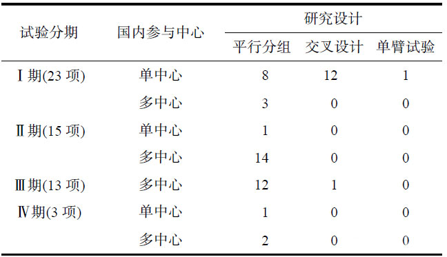 中国鼻用喷雾剂注册临床试验状态有进行中(尚未招募)、进行中(招募中)、进行中(招募完成)、已完成和主动终止5个状态,分别有13项(16.3%)、15项(18.8%)、7项(8.8%)、44项(55.0%)和1项(1.3%)。Ⅰ~Ⅳ期临床试验共55项,其中平行分组试验41项(74.5%)、交叉设计试验14项(23.5%)、单臂试验1项(1.8%)。按照参与中心分类,多中心试验33项(58.9%)、单中心试验23项(41.1%)。24项Ⅰ期临床试验中,单中心试验20项,多中心试验4项;15项Ⅱ期临床试验中,单中心试验1项,多中心试验14项;13项Ⅲ期临床试验均为多中心试验;3项Ⅳ期临床试验中,单中心试验1项,多中心试验2项。