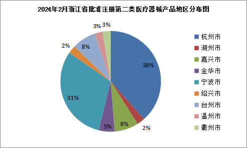 2024年2月,浙江省药品监督管理局共批准注册第二类医疗器械产品39个,其中有源类15个,无源类12个,体外诊断试剂12个(具体产品见附件)。按照注册申请人所在辖区分析,批准注册的39个医疗器械产品中,杭州市15个,湖州市1个,嘉兴市3个,金华市2个,宁波市12个,绍兴市1个,台州市3个,衢州市1个,温州市1个。