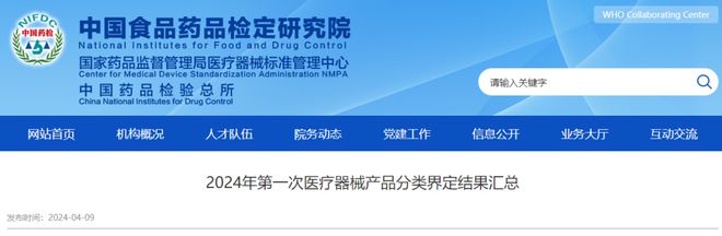 4月9日,国家药监局医疗器械标准管理中心发布了《2024年第一次医疗器械产品分类界定结果汇总》。