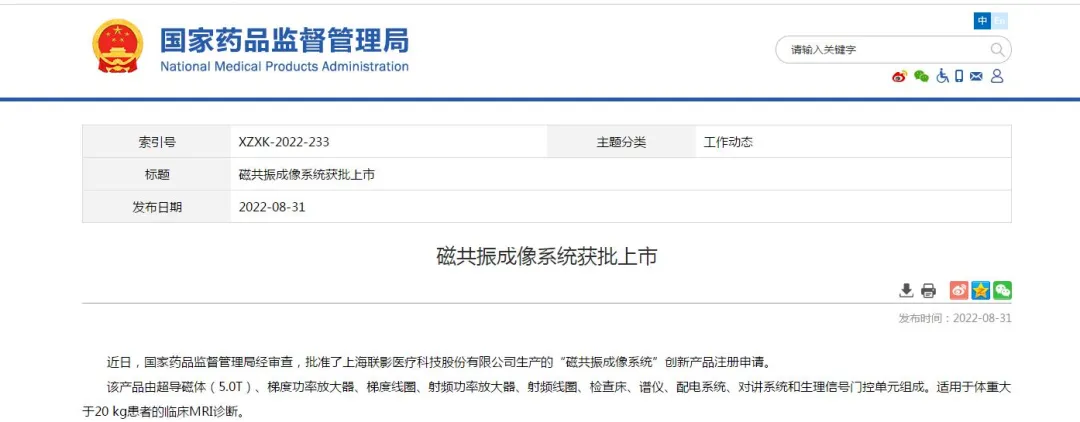 2022年9月,国家药品监督管理局经审查,批准了上海联影医疗科技股份有限公司生产的“磁共振成像系统”创新产品注册申请。