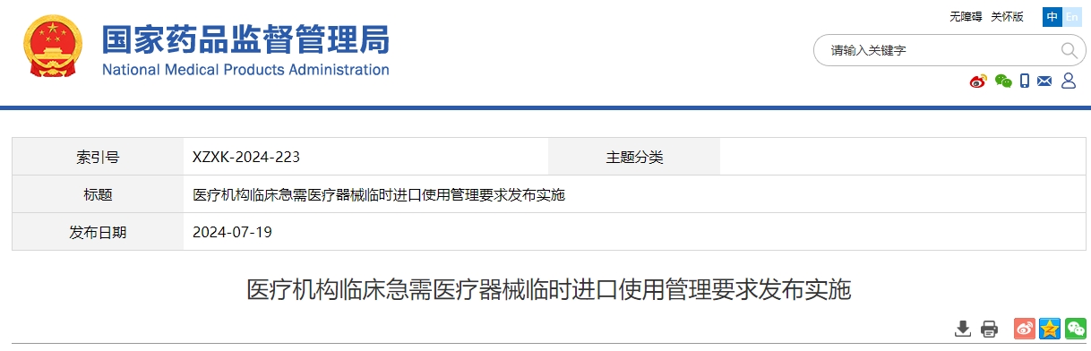 为全面落实《医疗器械监督管理条例》(国务院令第739号)要求,进一步满足特定临床急需用械需求,国家药监局会同国家卫生健康委印发《医疗机构临床急需医疗器械临时进口使用管理要求》(2024年第97号公告,以下简称《管理要求》),有效提高特殊情况下临床急需医疗器械可及性,切实增进人民群众健康福祉。