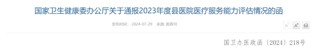 2024年7月29日,国家卫生健康委办公厅发布了关于通报2023年度县医院医疗服务能力评估情况的函(以下简称“《函》”)。