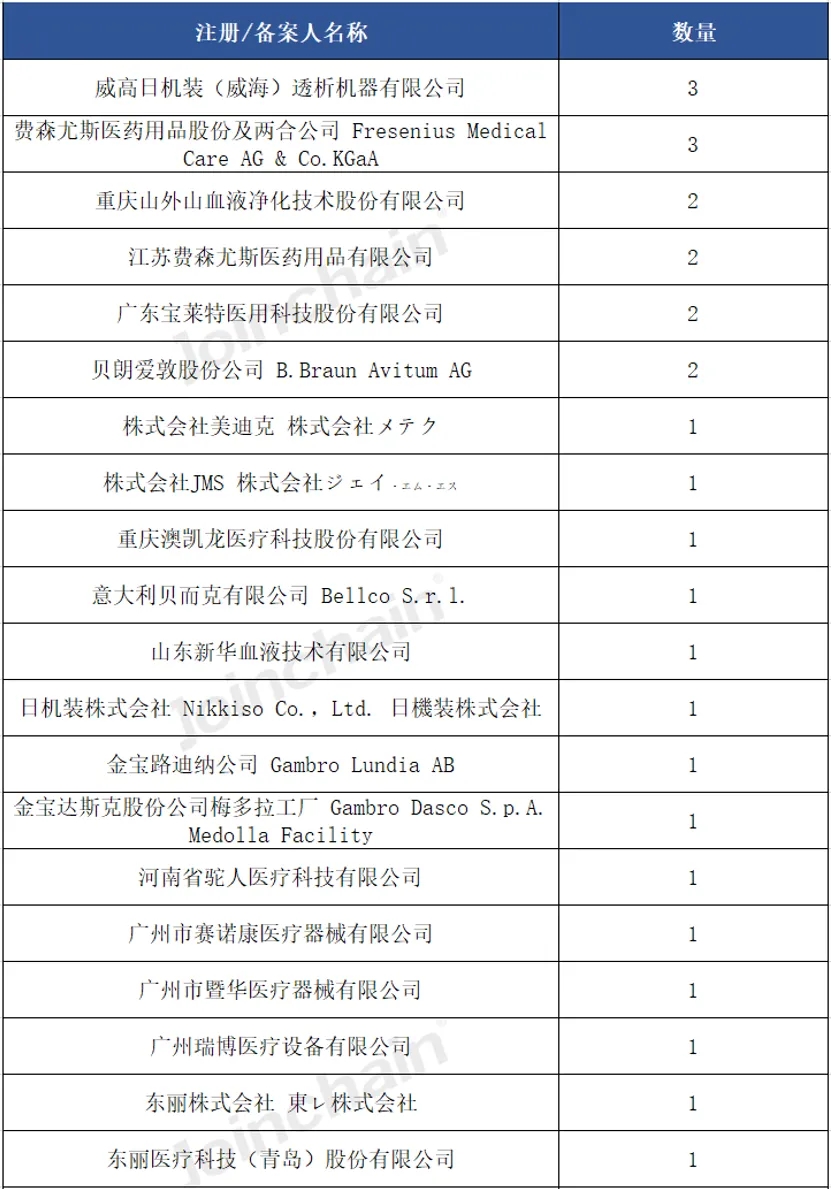 从产品注册人的获批数量来看,国产品牌威高日机装和进口品牌费森尤斯的注册数量均高于其他企业。
