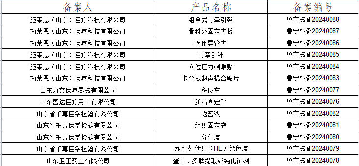 | 1 | 济南市高新区 | 山东蓝勤医疗科技有限公司 | 第一类医疗器械备案 | 疝气固定带 | 鲁济械备20240467 |
