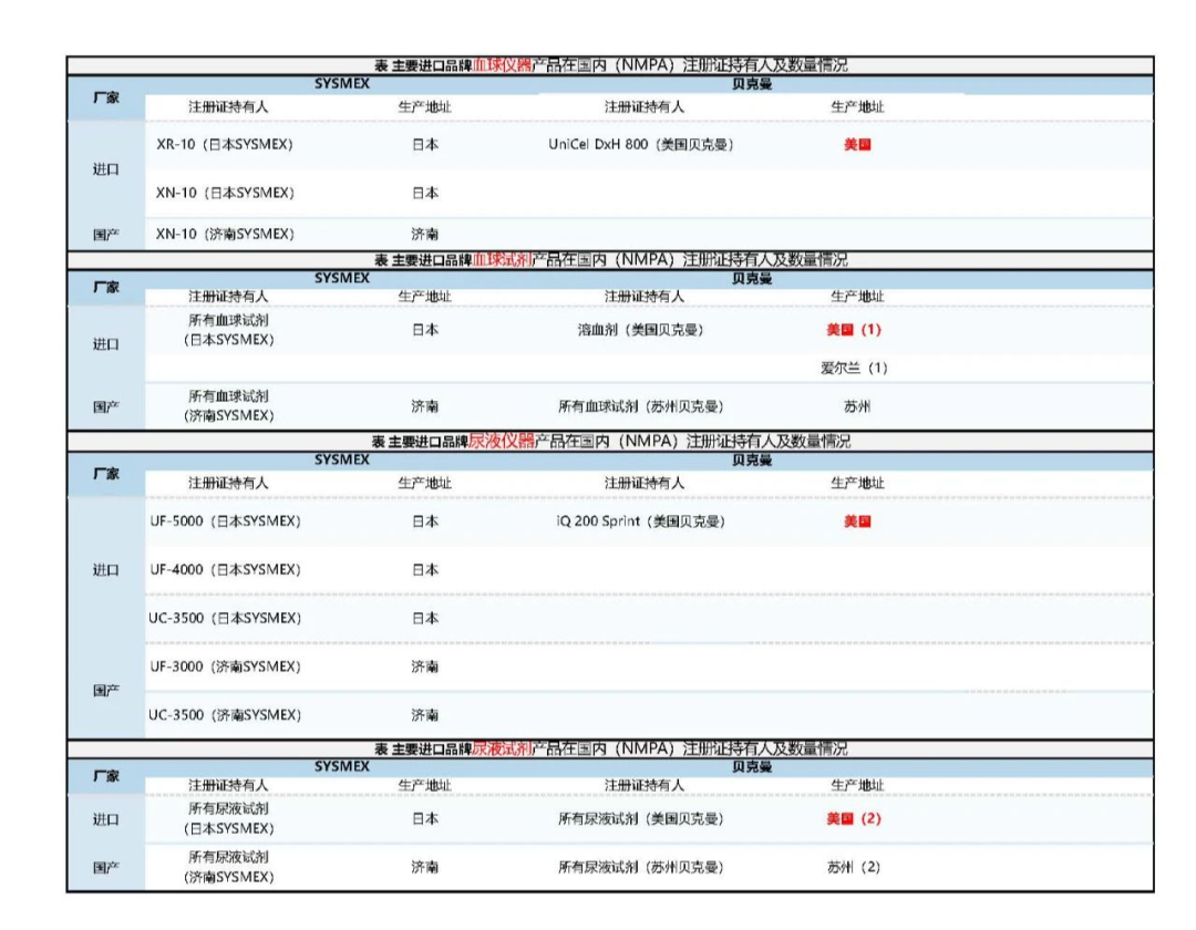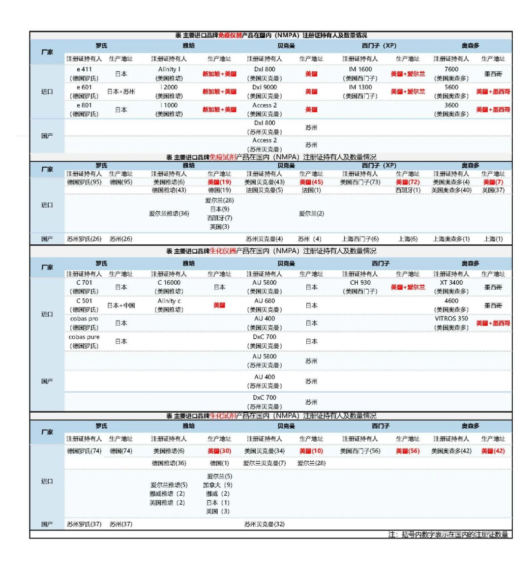 飞速度CRO梳理的注册信息显示,罗氏、贝克曼、西门子、奥森多等国际IVD巨头在华销售的产品中,大量关键设备及试剂仍依赖美国生产(见表1-表4)。以下为核心数据整理: