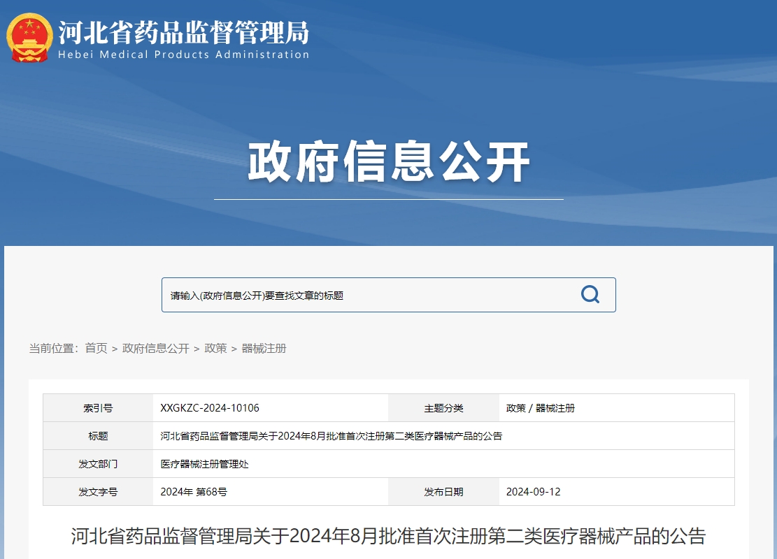 根据《医疗器械监督管理条例》《中华人民共和国政府信息公开条例》等法规规定,现将我局2024年8月批准的首次注册第二类医疗器械产品及新开办生产企业目录,信息公告如下(名