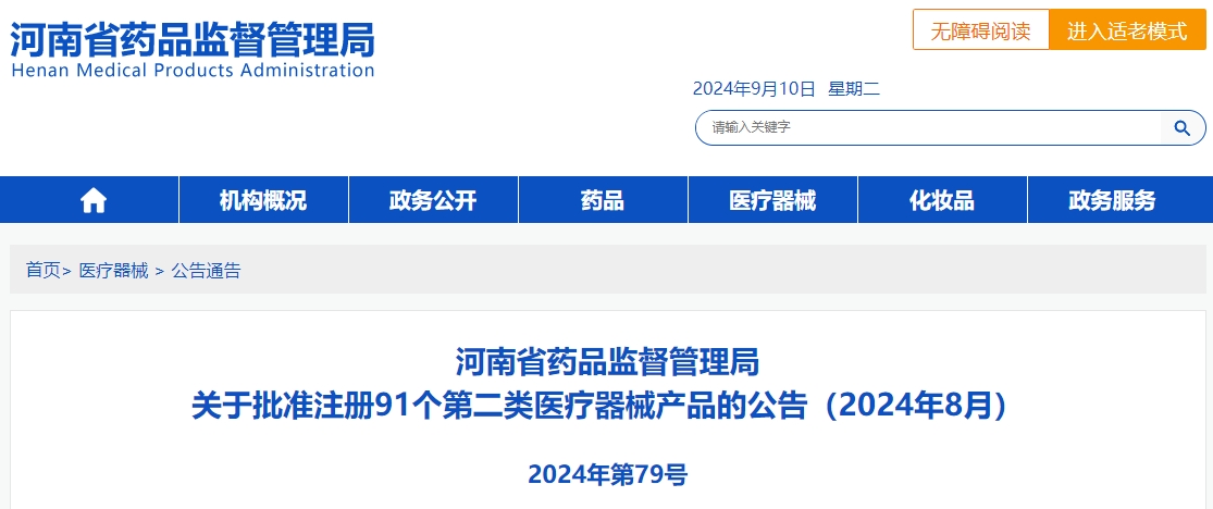 2024年8月,河南省药品监督管理局共批准注册第二类医疗器械产品91个,具体产品详见附件。 特此公告。 附件:2024年8月批准注册医疗器械产品目录 2024年9月9日2024年