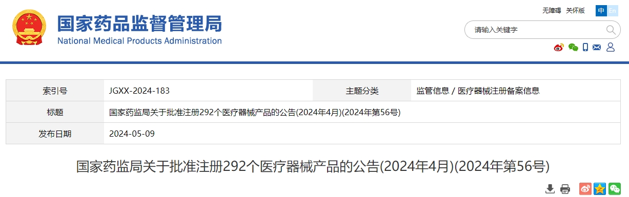 2024年4月,国家药监局共批准注册医疗器械产品292个。其中,境内第三类医疗器械产品224个,进口第三类医疗器械产品37个,进口第二类医疗器械产品30个,港澳台医疗器械产品1个(具