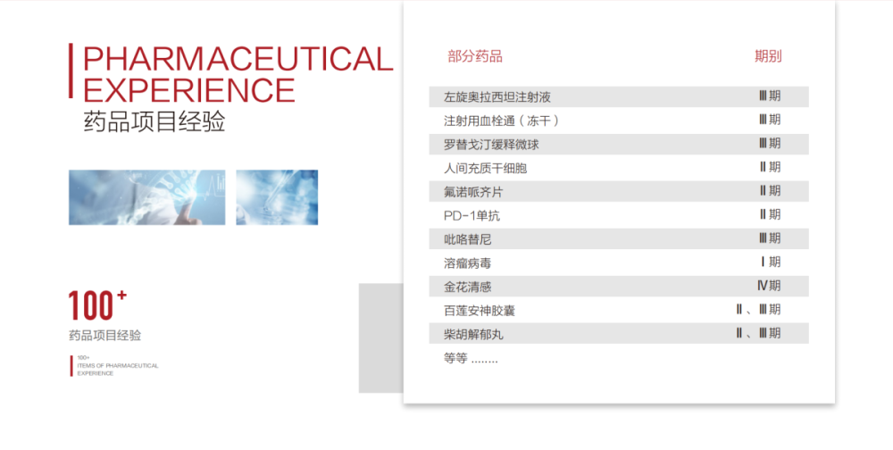 截止到目前,飞速度已经拥有一百以上的药物项目经验,不管是Ⅰ期、Ⅱ期、Ⅲ期、Ⅳ期药品的临床,我们都拥有丰富的技术团队和基地来支撑。